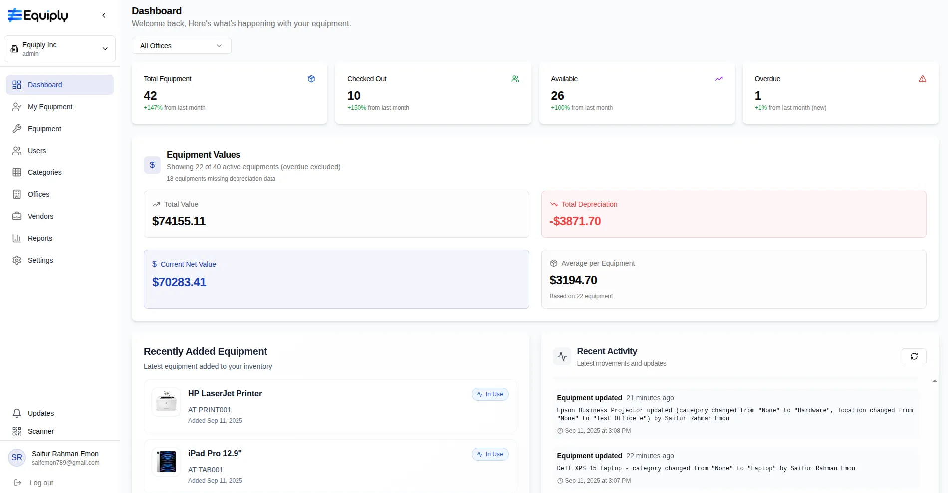 Equiply’s dashboard shows total, checked-out, available, and overdue items in real time. You can also see financial valuations statistics and live activity feeds at a glance. In Cheqroom, you need to generate separate reports to view insights on usage or value.